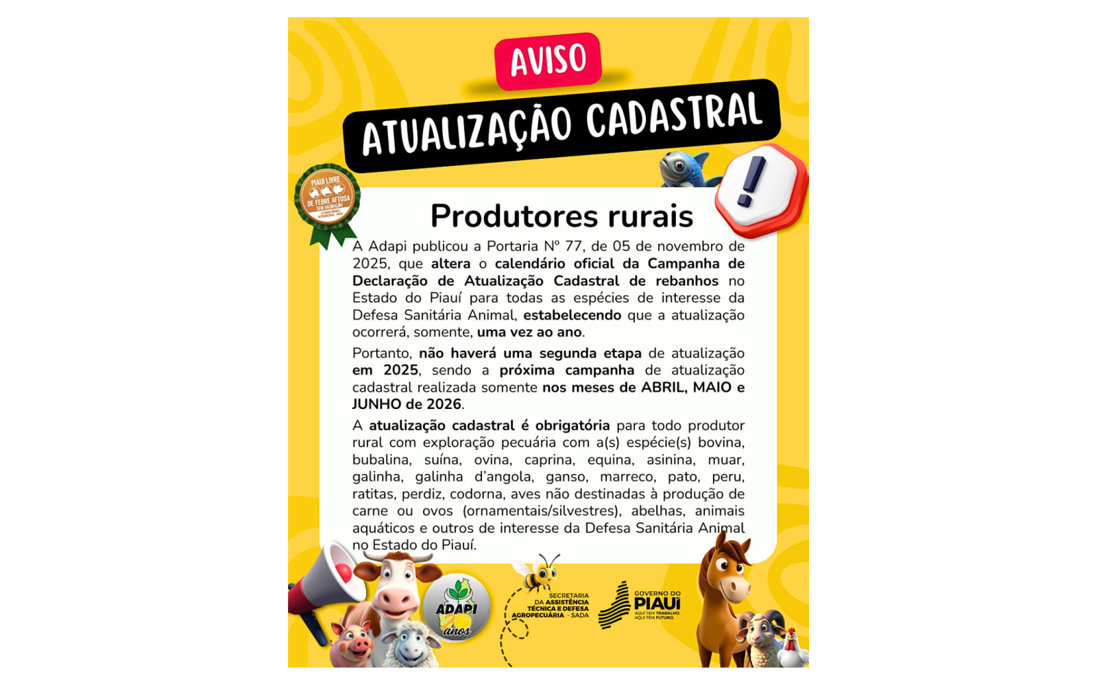 Comunicado: Portaria ADAPI nº 077/2025 – Nova Regulamentação da Atualização Cadastral de Rebanhos no Piauí