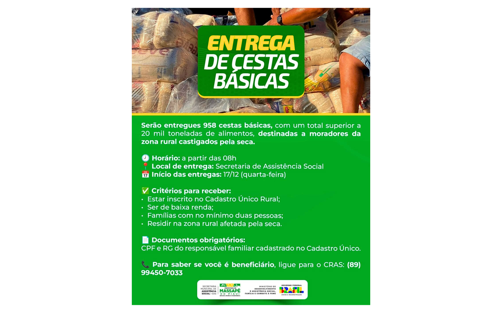 A Prefeitura de Massapê do Piauí, por meio da Secretaria Municipal de Assistência Social, Trabalho, Cidadania e Políticas Integradas, realizará a entrega de cestas básicas para famílias da zona rural afetadas pela seca. A ação terá início no dia 17 de dezembro (quarta-feira), a partir das 8h, na Secretaria Municipal de Assistência Social.