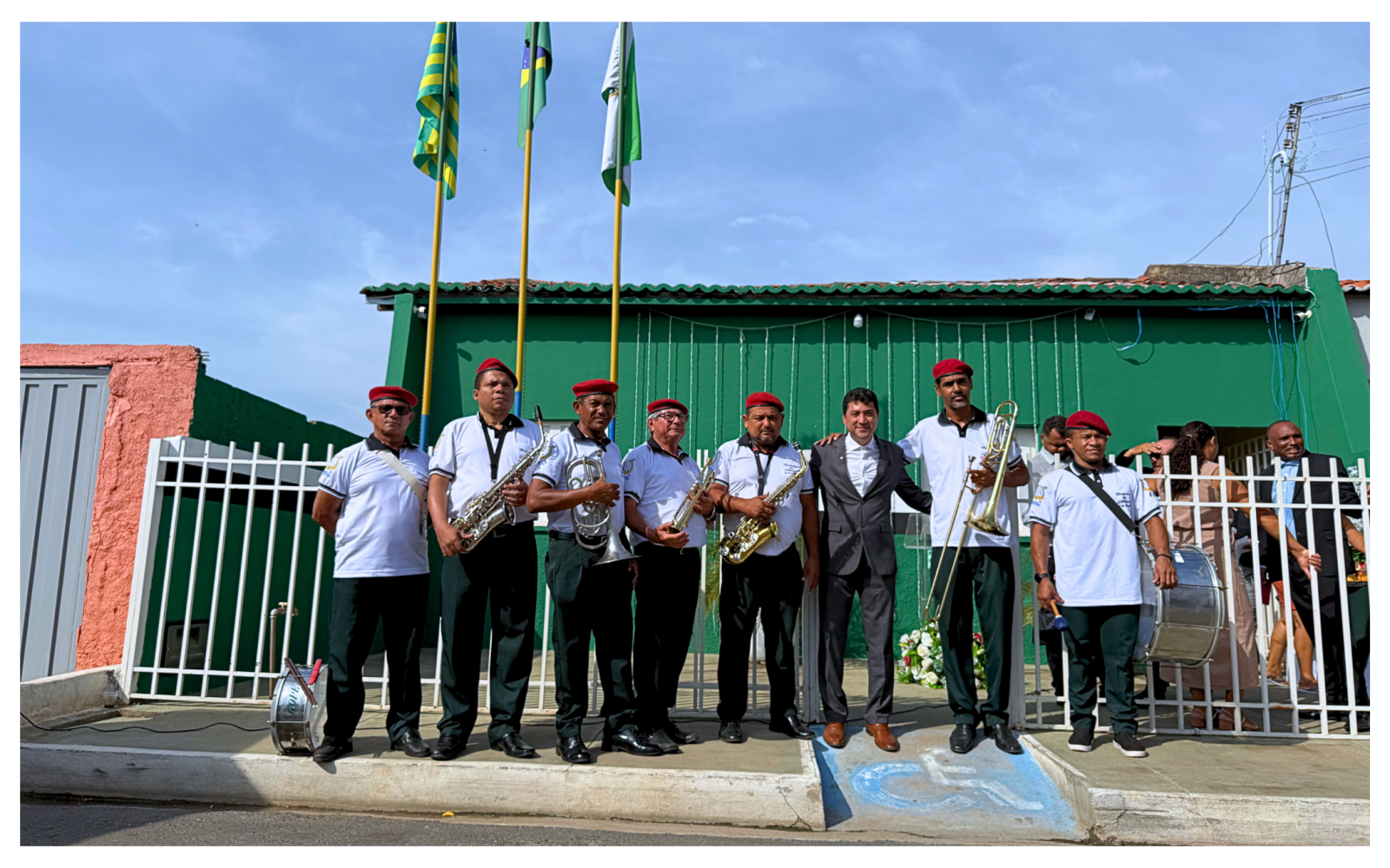 Na sequência, ocorreu o hasteamento das bandeiras, um dos momentos centrais da programação. O ato cívico contou com o acompanhamento da Banda Marcial do município, contribuindo para a solenidade e o caráter institucional do evento.