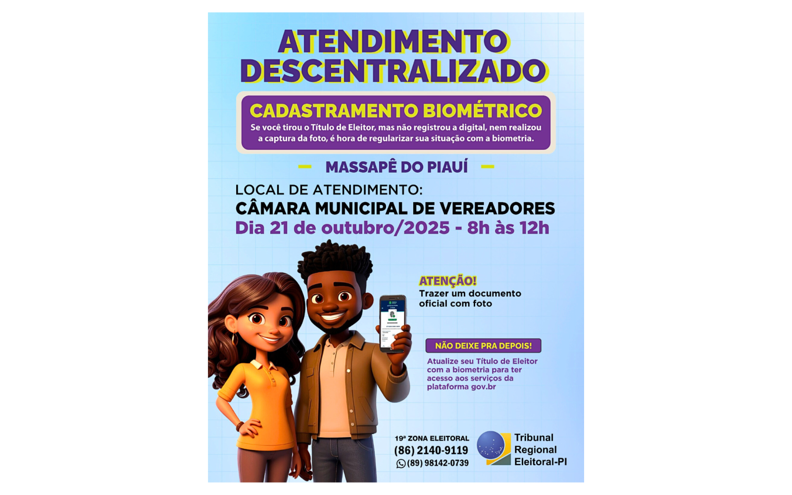A Prefeitura de Massapê do Piauí informa que será realizado, no próximo dia 21 de outubro de 2025, um atendimento descentralizado para cadastramento biométrico de eleitores. A ação acontecerá na Câmara Municipal de Vereadores de Massapê do Piauí, das 8h às 12h, e é promovida pelo Tribunal Regional Eleitoral do Piauí (TRE-PI), por meio da 19ª Zona Eleitoral.