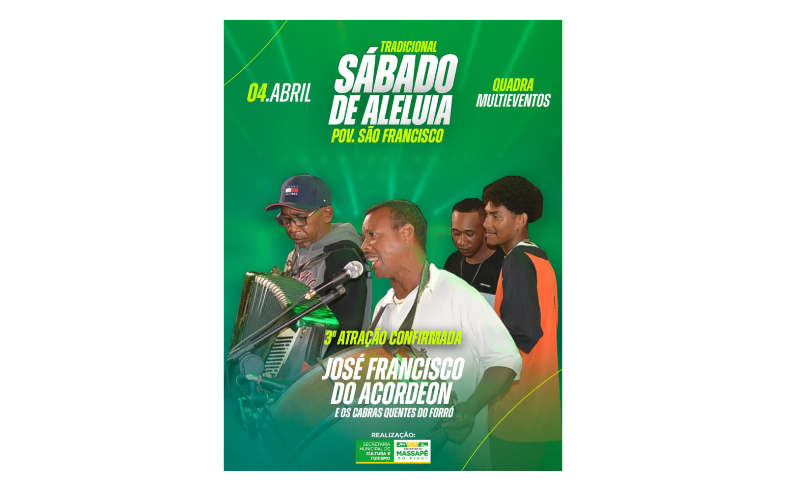 Na manhã desta sexta-feira, 27 de março, a Secretaria Municipal de Cultura e Turismo de Massapê do Piauí, anunciou mais uma atração do tradicional Sábado de Aleluia do Povoado São Francisco – edição 2026, evento que integra o calendário cultural do município e reúne moradores e visitantes em um momento de celebração e convivência comunitária.