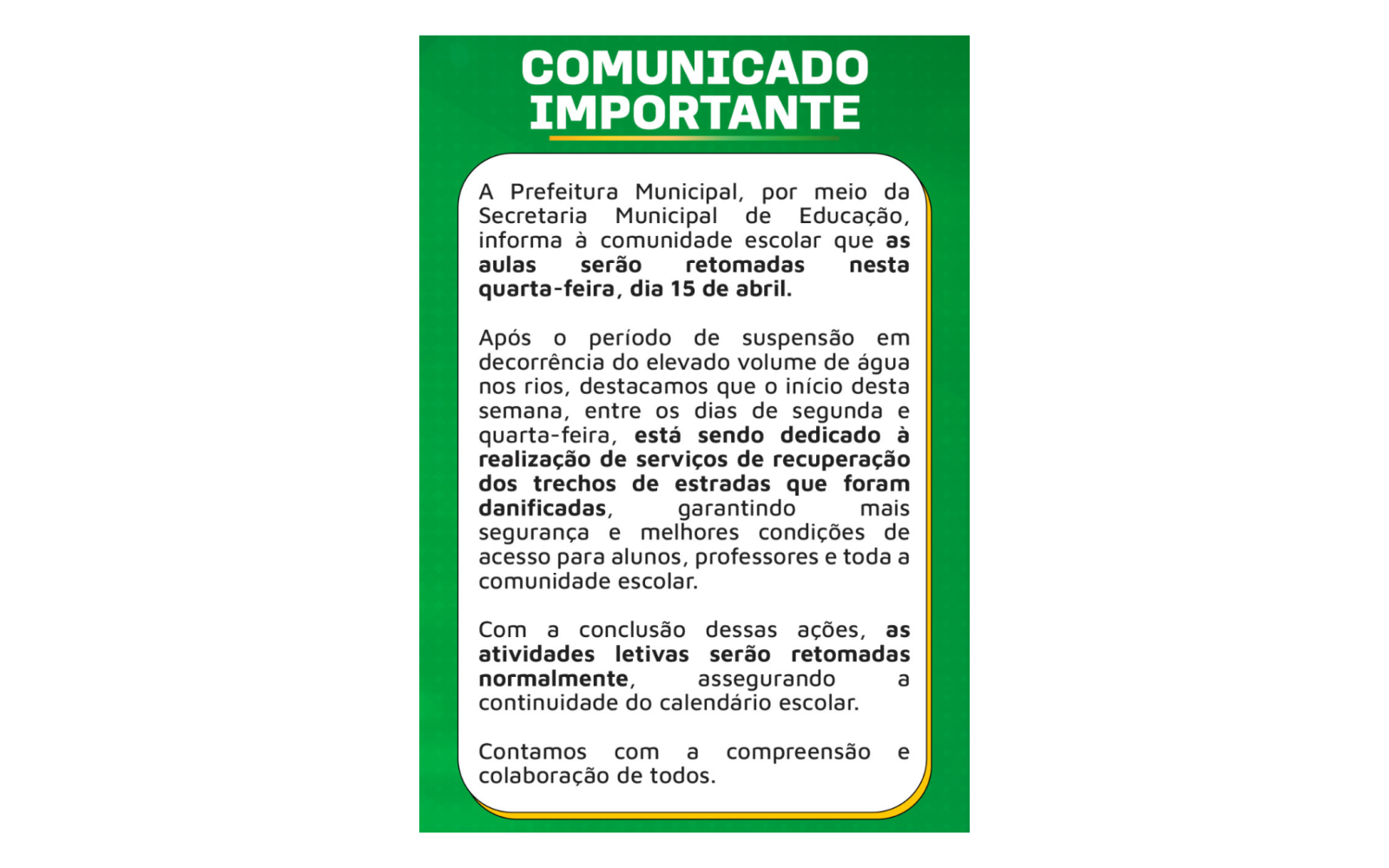 De acordo com o comunicado oficial, a paralisação ocorreu em decorrência do elevado volume de água nos rios, que comprometeu o acesso de estudantes, professores e demais integrantes da comunidade escolar, especialmente nas áreas rurais do município.