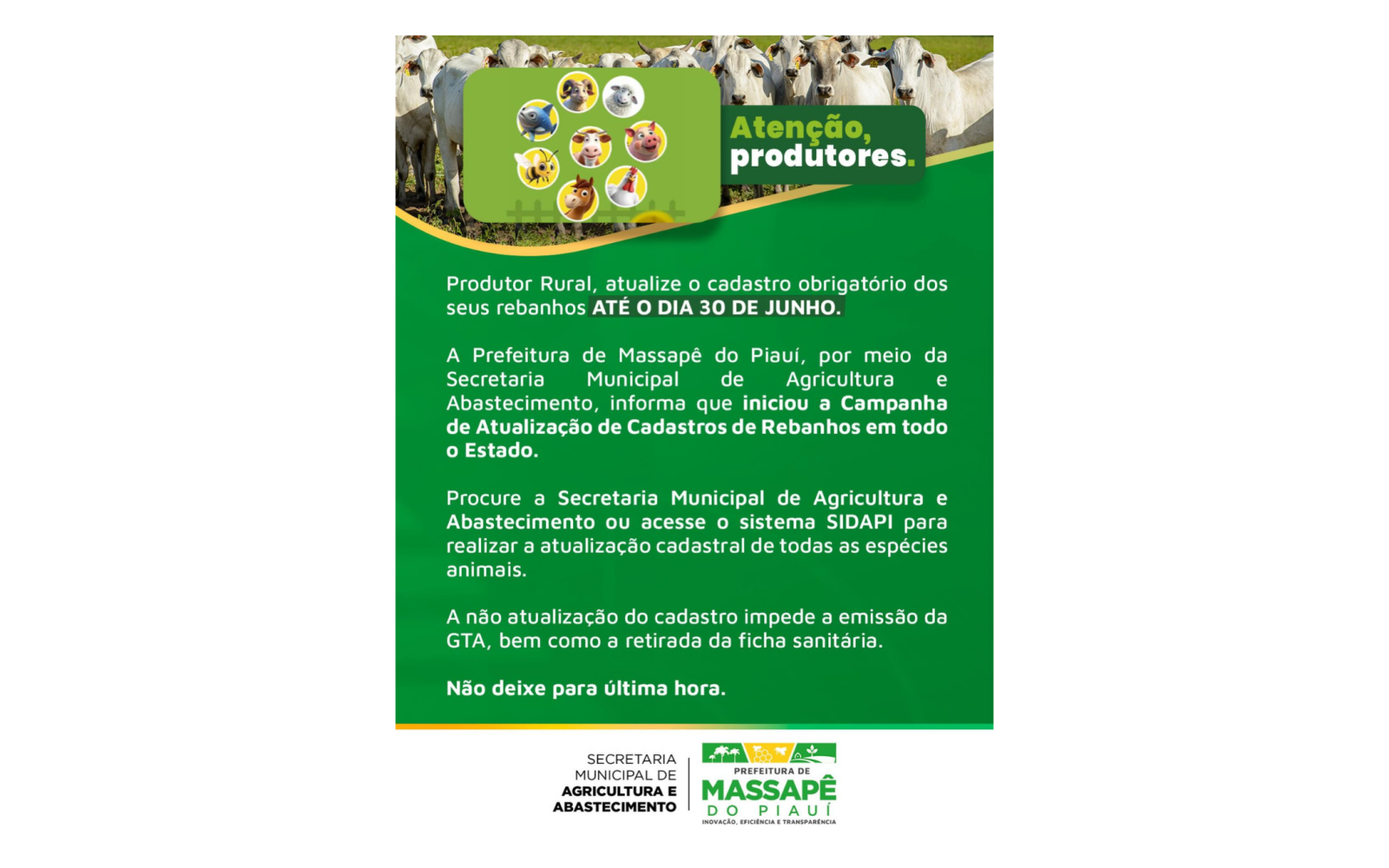 A Prefeitura de Massapê do Piauí, por meio da Secretaria Municipal de Agricultura e Abastecimento, está mobilizando os produtores rurais para participarem da Campanha de Atualização Cadastral de Rebanhos, que segue em todo o estado do Piauí até o dia 30 de junho de 2026. A iniciativa, coordenada pela Secretaria da Assistência Técnica e Defesa Agropecuária (Sada) em parceria com a Agência de Defesa Agropecuária do Piauí (Adapi), terá início em 1º de abril e é obrigatória para todos os criadores.