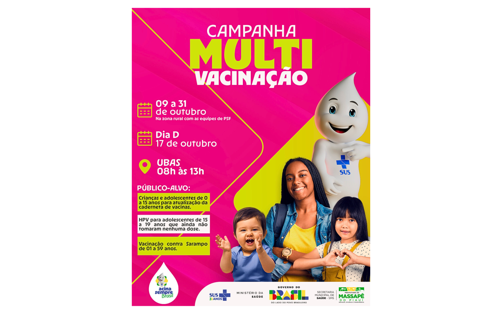 A Prefeitura de Massapê do Piauí, por meio da Secretaria Municipal de Saúde, realizará de 9 a 31 de outubro de 2025 a Campanha de Multivacinação, com o objetivo de atualizar a caderneta de vacinação de crianças e adolescentes e reforçar a imunização da população contra doenças preveníveis.