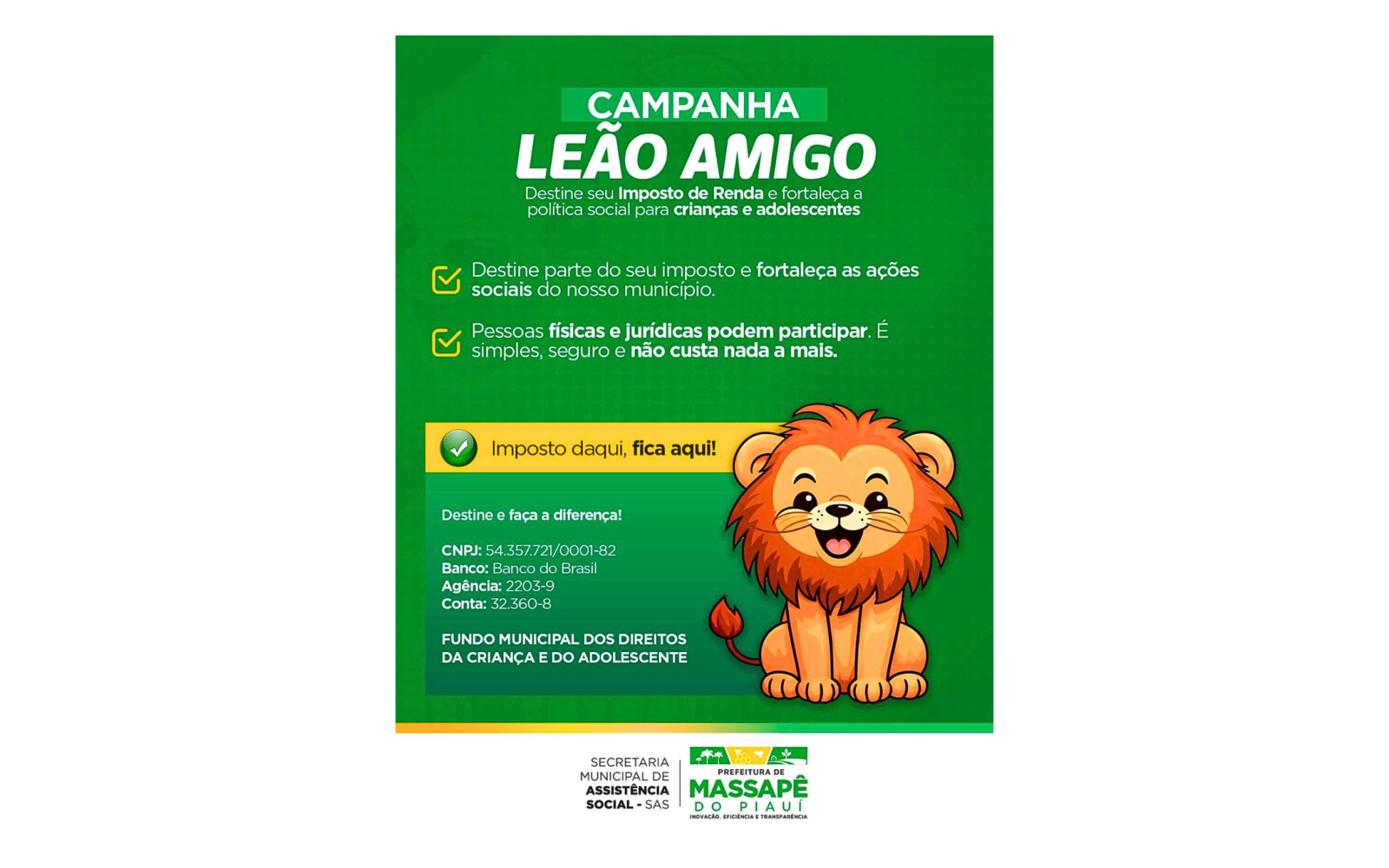 A Prefeitura de Massapê do Piauí, por meio da Secretaria Municipal de Assistência Social, Trabalho, Cidadania e Políticas Integradas, está promovendo a Campanha Leão Amigo, iniciativa que incentiva a população a destinar parte do Imposto de Renda ao Fundo Municipal dos Direitos da Criança e do Adolescente. A ação tem como objetivo fortalecer as políticas públicas voltadas ao atendimento de crianças e adolescentes no município.