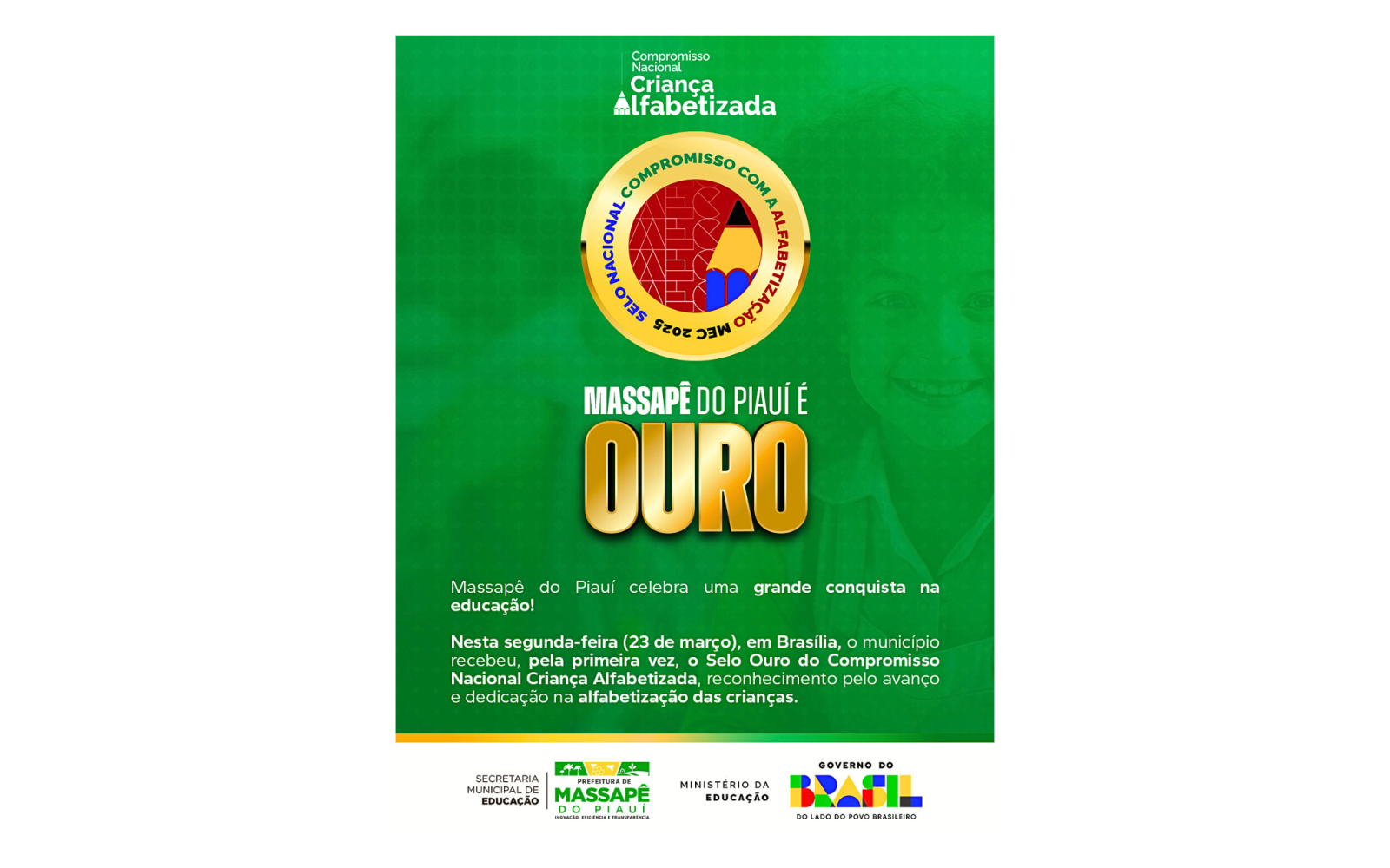 O Selo Ouro do Compromisso Nacional Criança Alfabetizada integra uma política nacional que busca garantir que todas as crianças estejam alfabetizadas nos primeiros anos do ensino fundamental. Ao alcançar esse reconhecimento, Massapê do Piauí reforça o compromisso com a educação pública e com a continuidade de ações voltadas à aprendizagem dos estudantes.