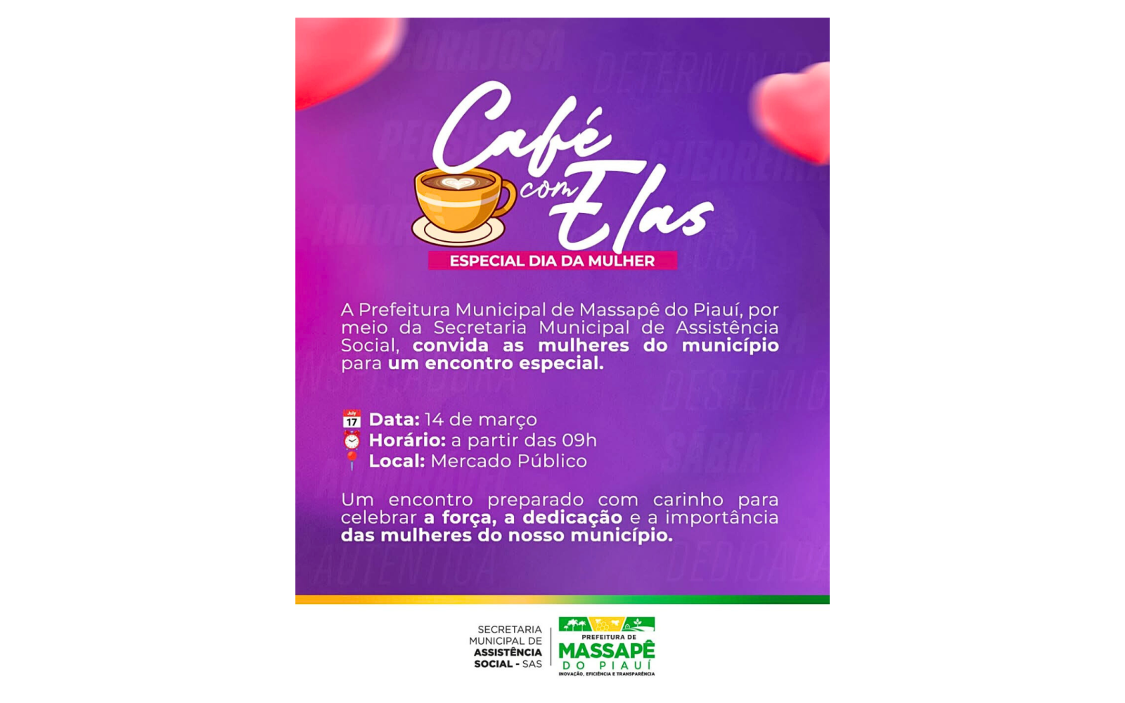 A Prefeitura de Massapê do Piauí, por meio da Secretaria Municipal de Assistência Social (SAS), promove nesta sexta-feira, 14 de março, o evento “Café com Elas – Especial Dia da Mulher”, iniciativa voltada à valorização e ao reconhecimento da participação feminina na comunidade.