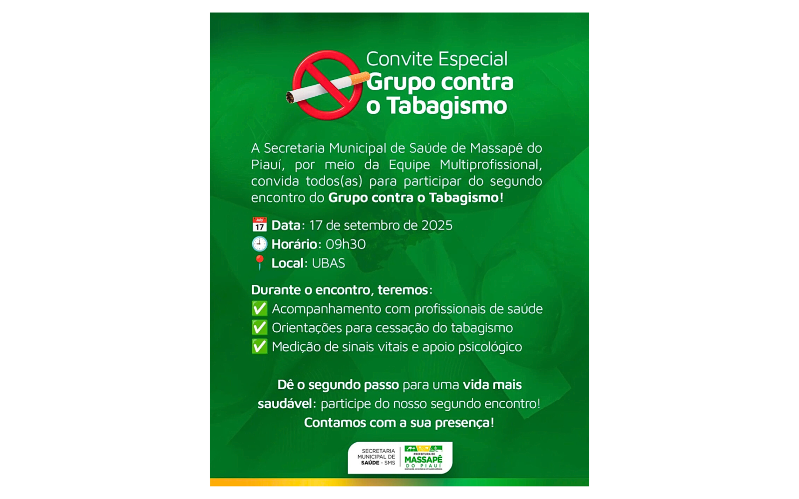 A Prefeitura Municipal de Massapê do Piauí, por meio da Secretaria Municipal de Saúde, promove no dia 17 de setembro, quarta-feira, o segundo encontro do Grupo contra o Tabagismo. A atividade será realizada às 9h30, na UBAS José Joaquim na sede do município.