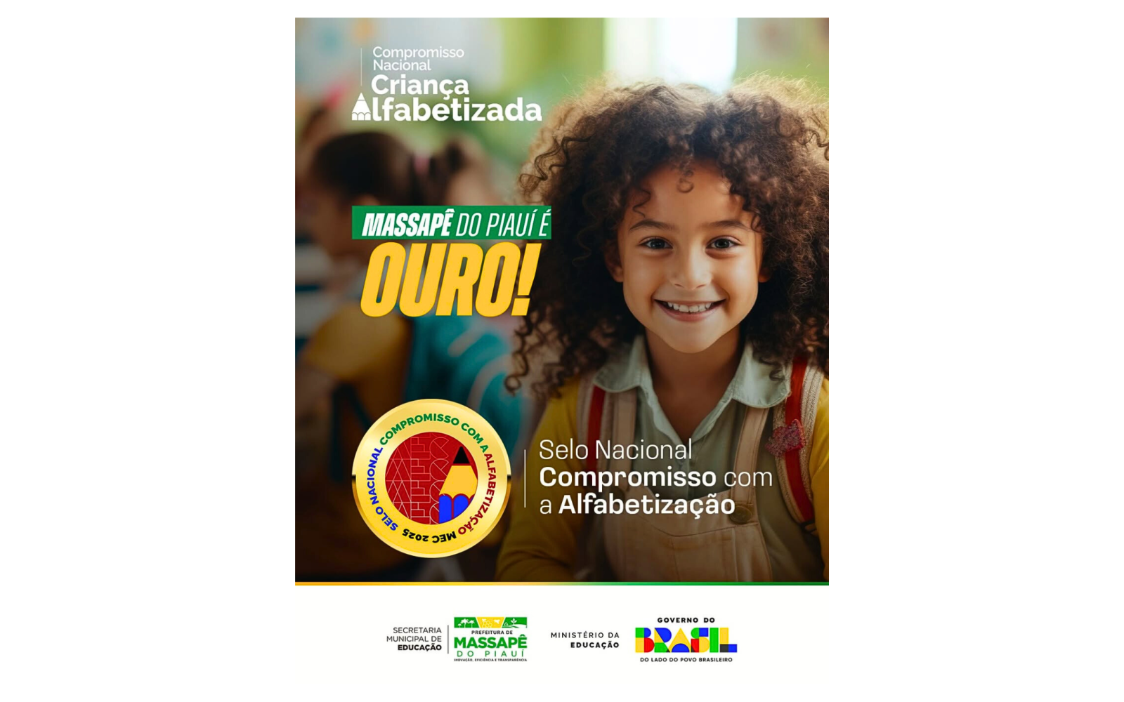O município de Massapê do Piauí conquistou o Selo Ouro de Alfabetização, certificação concedida pelo Compromisso Nacional Criança Alfabetizada, iniciativa do Governo Federal, por meio do Ministério da Educação (MEC). O reconhecimento avalia o desempenho das redes municipais de ensino no processo de alfabetização das crianças até o final do 2º ano do ensino fundamental.