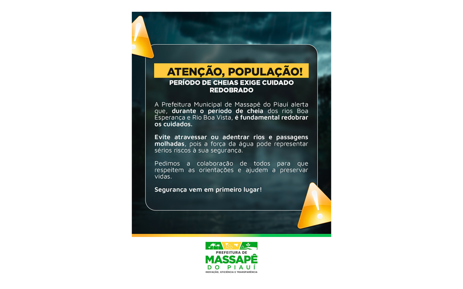 A Prefeitura de Massapê do Piauí emitiu um alerta à população em razão do período de cheias dos rios Boa Esperança e Rio Boa Vista, que tem exigido cuidados redobrados por parte dos moradores. A orientação foi divulgada por meio de comunicado oficial, com o objetivo de prevenir acidentes e garantir a segurança da população em áreas afetadas pelo aumento do volume de água.