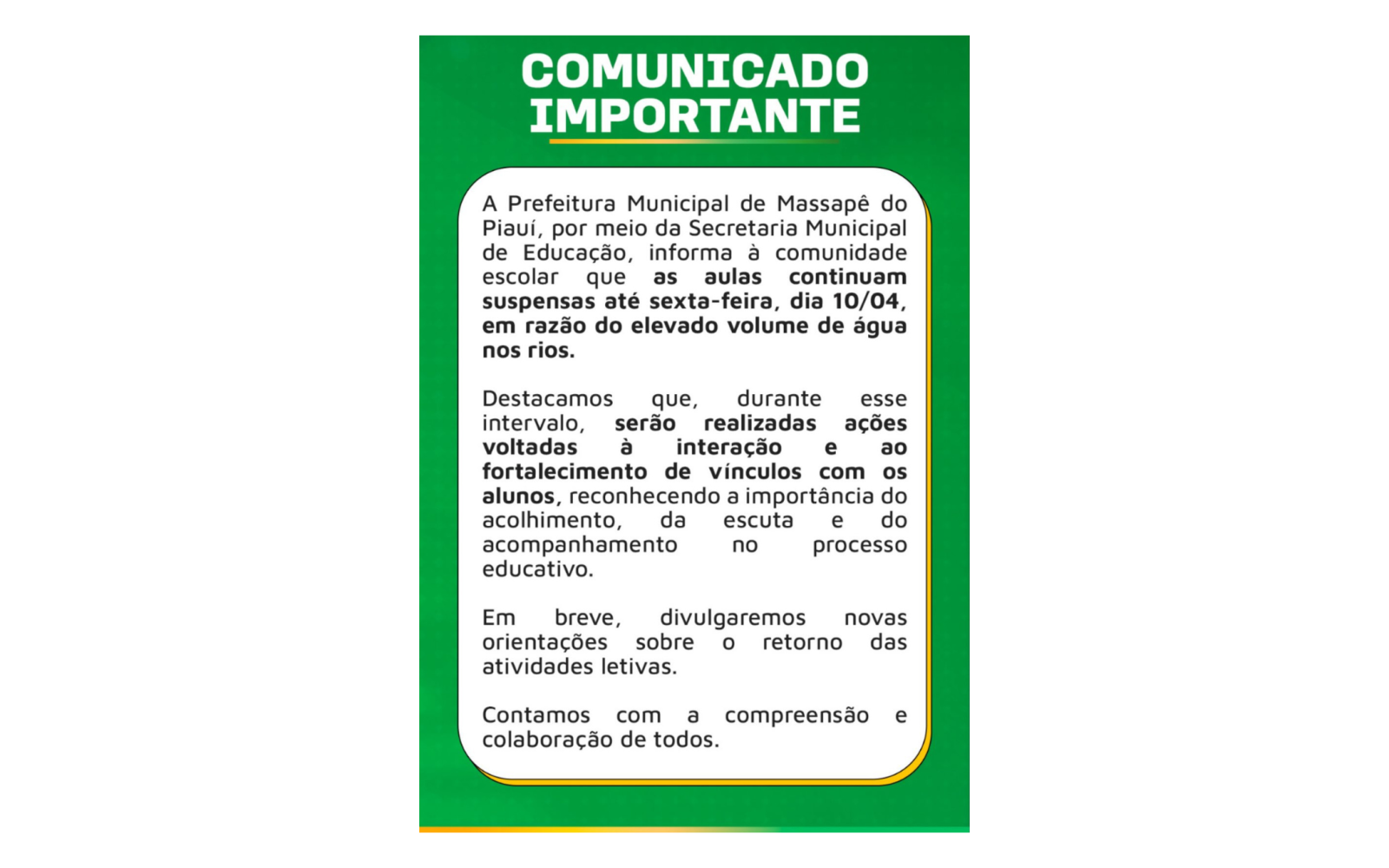 A Prefeitura de Massapê do Piauí, por meio da Secretaria Municipal de Educação, informou à comunidade escolar a continuidade da suspensão das aulas na rede municipal até a sexta-feira, dia 10 de abril, em razão do elevado volume de água nos rios da região. A medida tem caráter preventivo e busca garantir a segurança de estudantes, profissionais da educação e demais envolvidos no deslocamento até as unidades escolares.