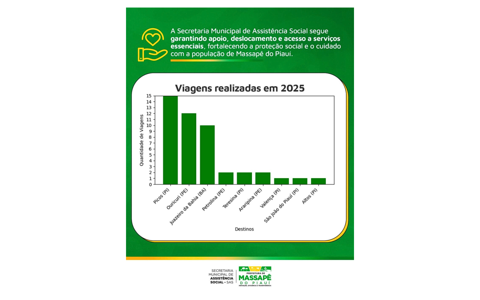 Ao longo do ano de 2025, a Secretaria Municipal de Assistência Social de Massapê do Piauí assegurou o transporte de usuários para a realização de perícia médica e avaliação social, etapas necessárias principalmente para a concessão do Benefício de Prestação Continuada (BPC).