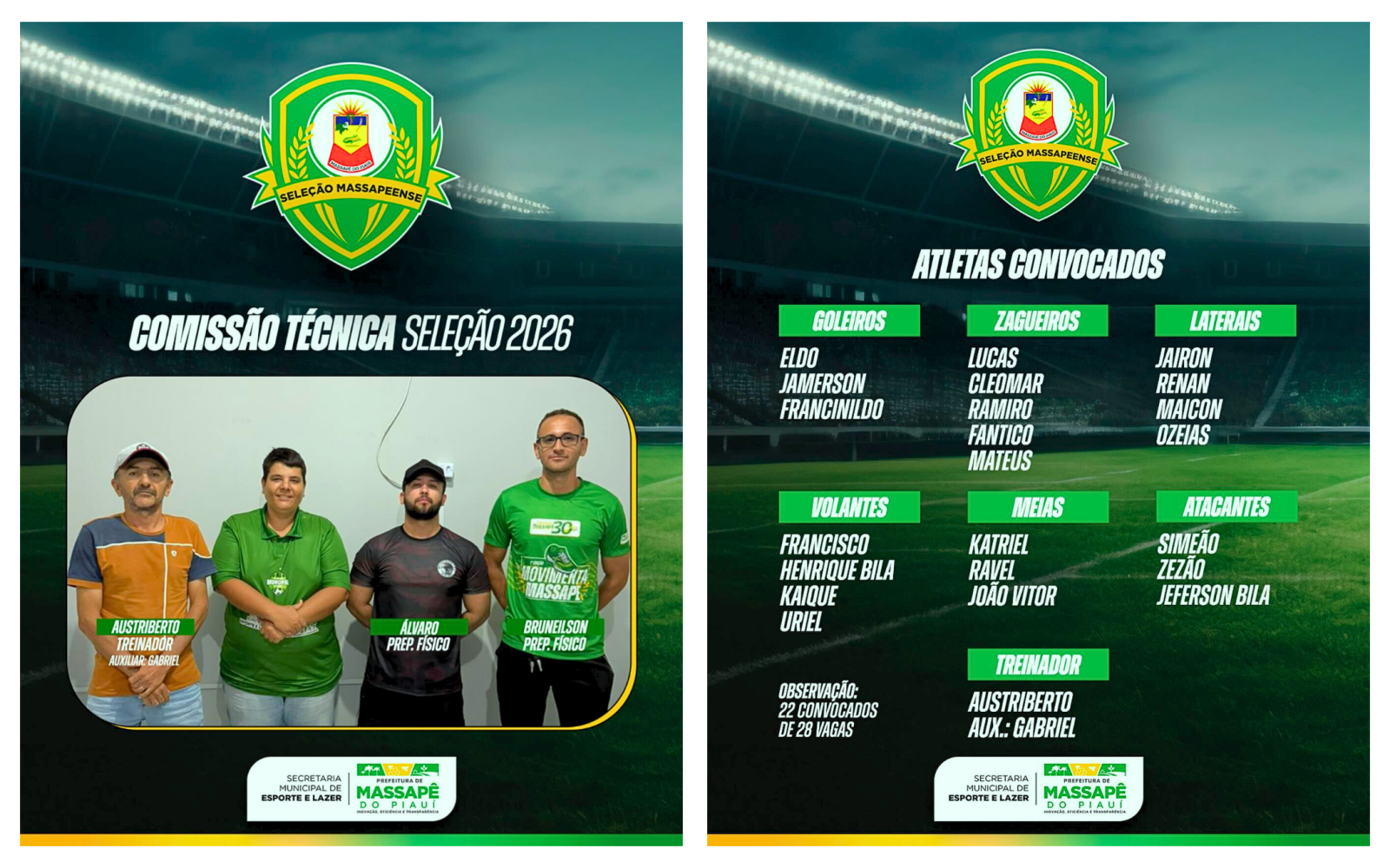A Prefeitura de Massapê do Piauí, por meio da Secretaria Municipal de Esporte e Lazer, oficializou a formação da Seleção Massapeense de Futebol para a temporada 2026. Neste primeiro momento, 22 atletas foram convocados, de um total de 28 vagas previstas, que poderão ser preenchidas ao longo da temporada conforme necessidade técnica.