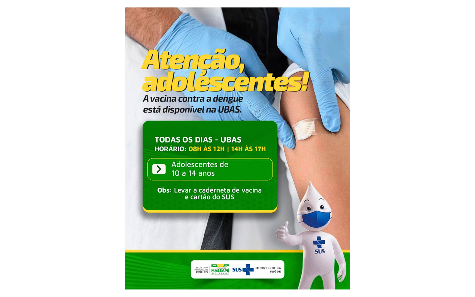 A Prefeitura de Massapê do Piauí, através da Secretaria Municipal de Saúde, está realizando a oferta da vacina contra a dengue para adolescentes de 10 a 14 anos na Unidade Básica de Saúde (UBAS) de José Joaquim de Moraes do município.