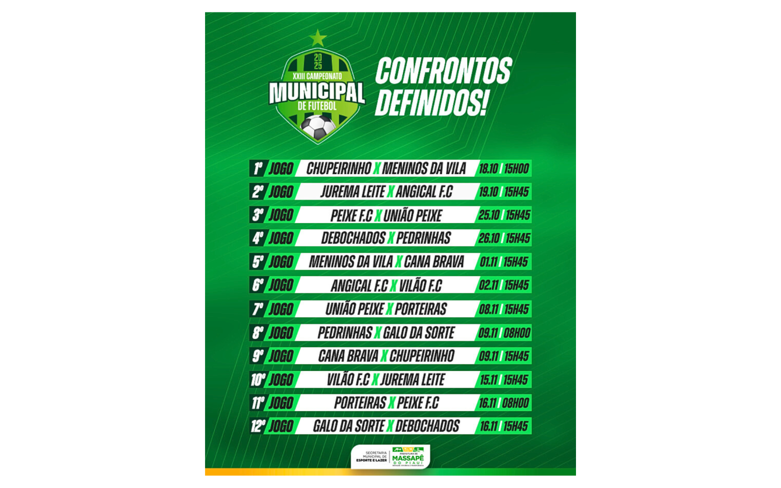 Ao todo, 12 partidas estão programadas, reunindo times do município e região. O primeiro jogo ocorrerá no sábado (18), às 15h00, entre as equipes Chupeirinho e Meninos da Vila. As demais partidas acontecerão até o dia 16 de novembro, sempre aos finais de semana, com horários variando entre 08h00 e 15h45.